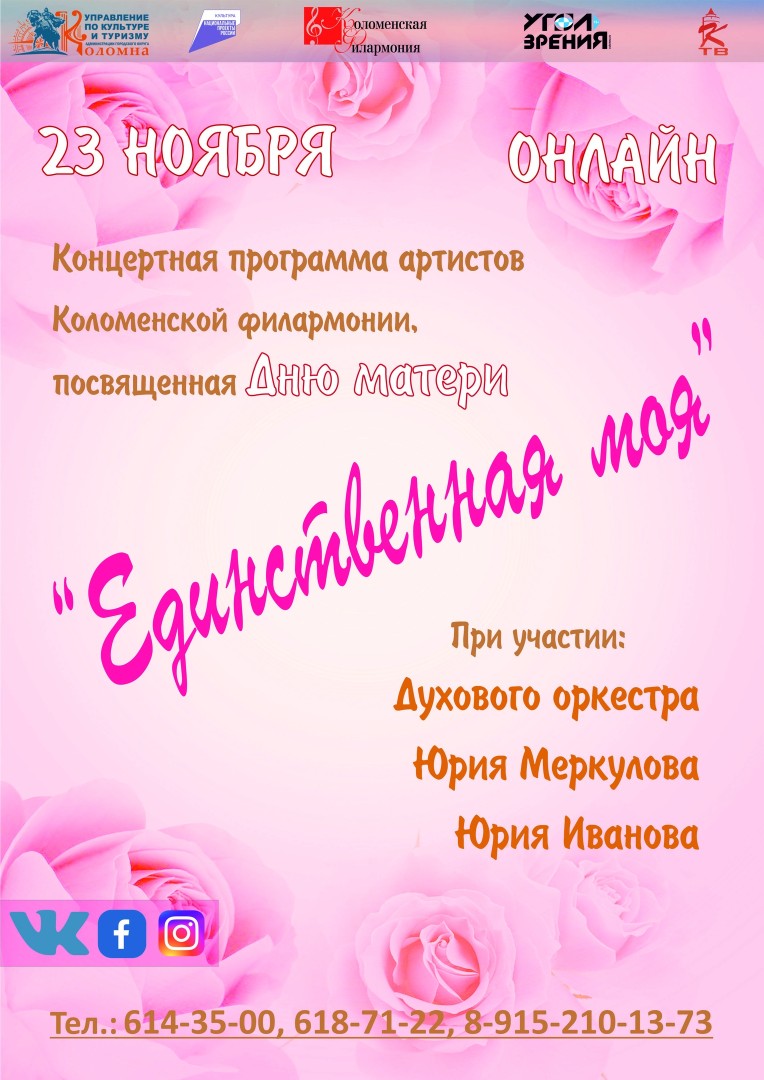 Дорогие друзья, 23 ноября Коломенская филармония приглашает на концертную онлайн программу, посвящённую «Дню матери» – «Единственная моя». В программе принимают участие: Духовой оркестр Коломенской филармонии, а также артисты филармонии – Юрий Иванов и Юрий Меркулов.