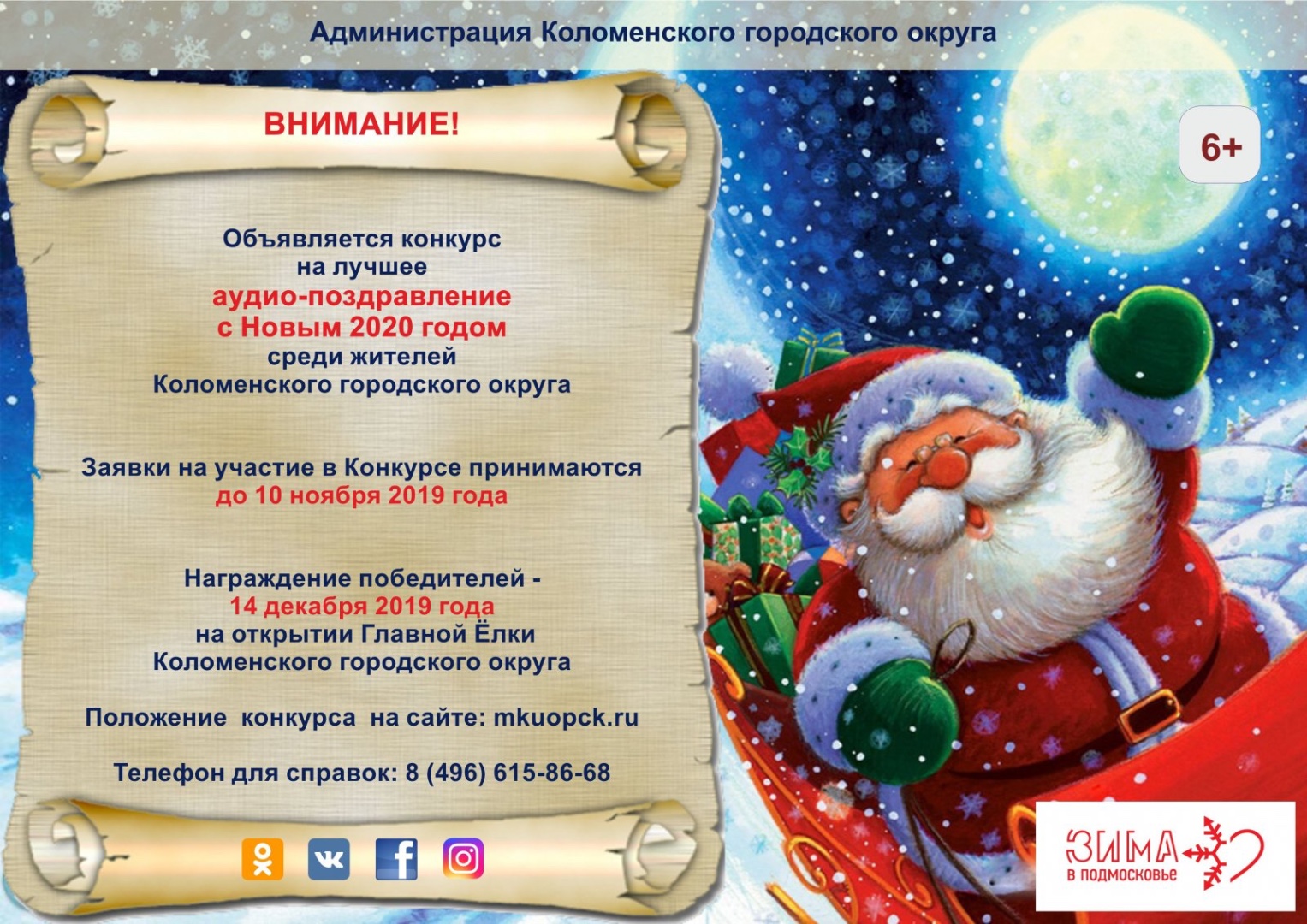 Лучшие авторы получат возможность записать свои поздравления в студии. Награждение победителей состоится 14 декабря на открытии Главной Ёлки Коломенского городского округа. Свои вопросы можно задать по телефону: 8 (496) 615-86-68.