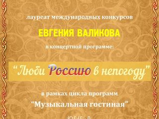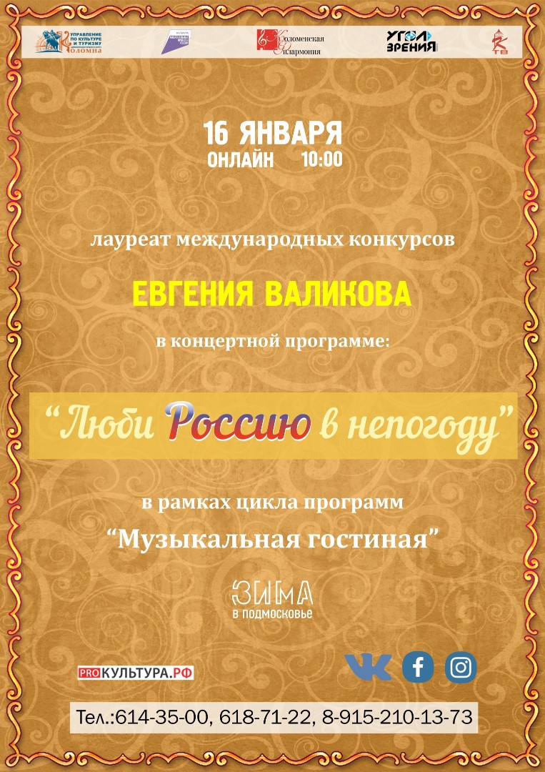 16 января в рамках цикла программ «Музыкальная гостиная» Коломенская филармония приглашает на ОНЛАЙН встречу с лауреатом всероссийских и международных конкурсов Евгенией Валиковой – «Люби Россию в непогоду». Выход программы – 10.00
