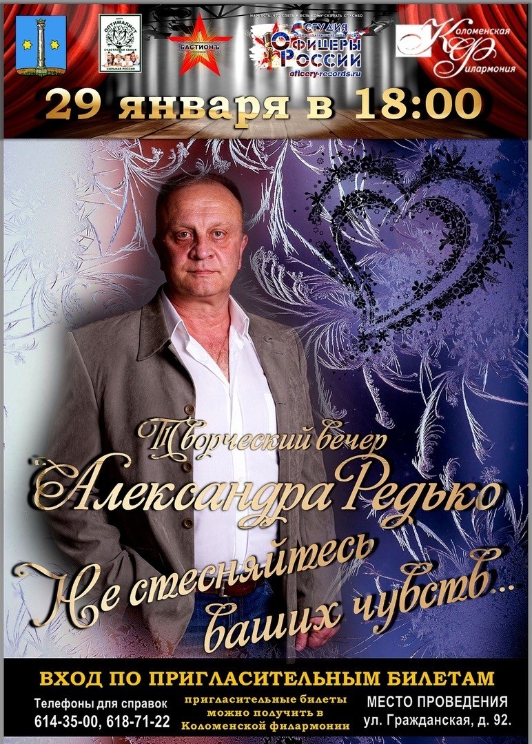 29 января в 18.00 Коломенская филармония приглашает на творческий вечер композитора и исполнителя, автора прекрасных стихов и проникновенной прозы Александра Редько.