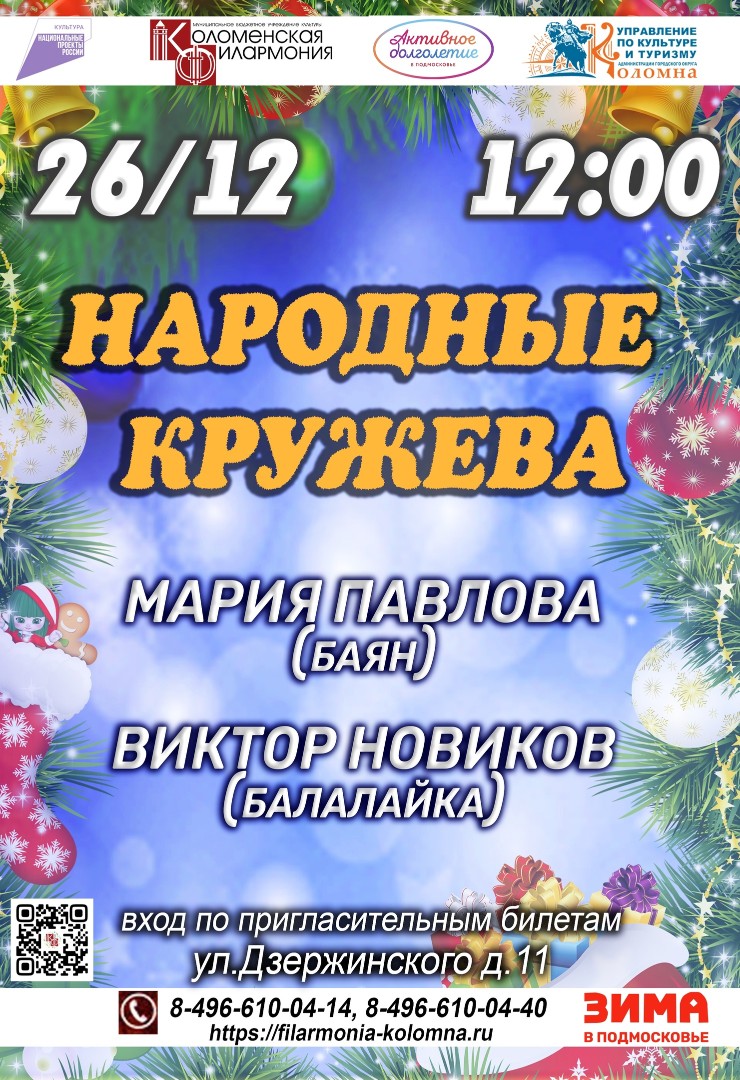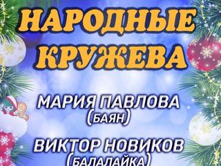 26 декабря в 12.00 ч. Коломенская филармония приглашает на концертную программу "Народные кружева". Для вас выступят солисты филармонии Мария Павлова (баян) и Виктор Новиков (балалайка). Исполнители представят зрителям музыкальные зарисовки на русские народные темы.