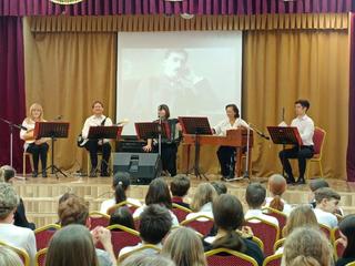 Мероприятие для 7-х и 10-х классов украшали музыкальные произведения Ансамбля народных инструментов «Музыкальный экспресс» МБУК «Коломенская филармония», руководитель Ольга Лоткова.
