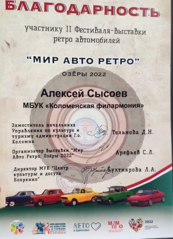 2 июля артист Коломенской филармонии Алексей Сысоев выступил с концертными номерами, в рамках ретро-выставки «Мир Авто Ретро. Озёры 2022».