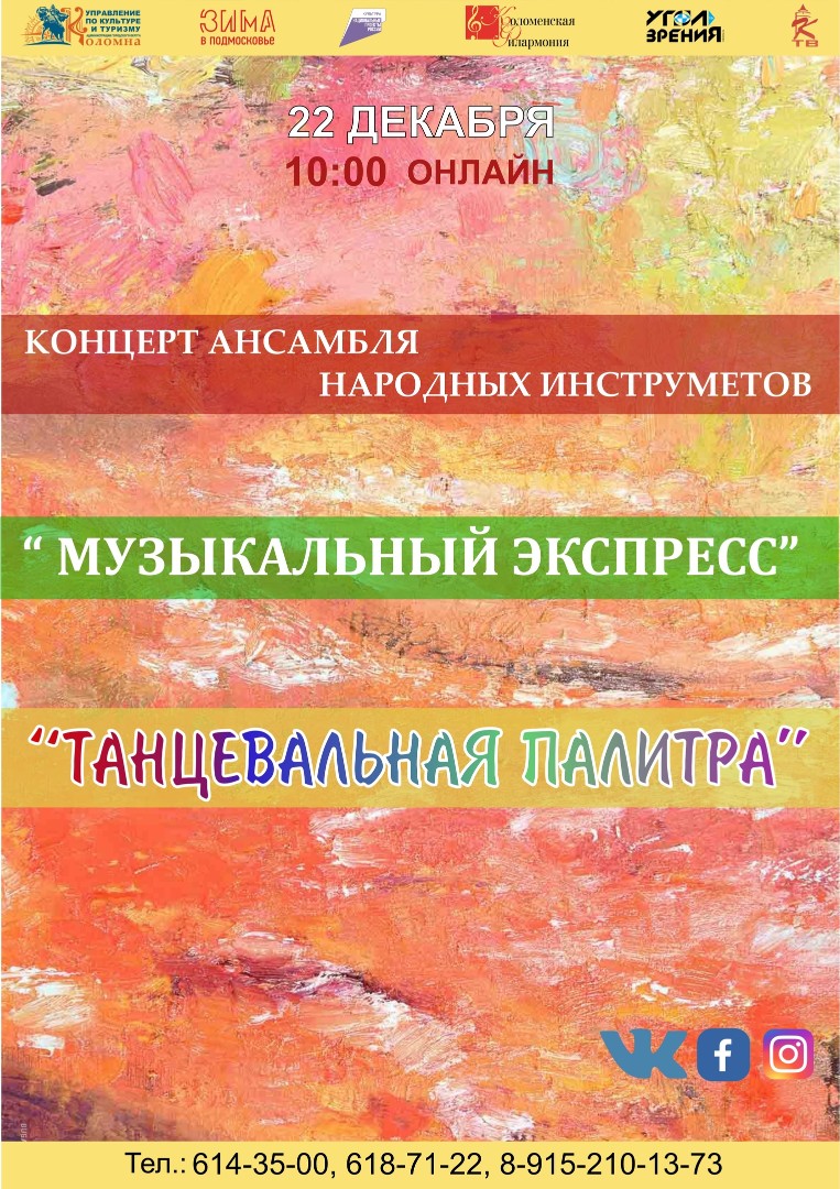 22 декабря ансамбль народных инструментов «Музыкальный экспресс» Коломенской филармонии приглашает вас на онлайн программу «Танцевальная палитра». Творческий сезон для коллектива оказался полон самых разных находок и открытий. Вас ждут не только лучшие, но и новые танцевальные композиции, которых вы ещё не слышали.