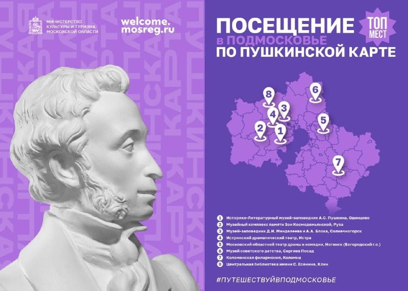 «Пушкинская карта» – это уникальная возможность для молодежи побывать в лучших музеях, театрах, филармониях и библиотеках страны. Любой человек в возрасте от 14 до 22 лет может получить эту карту – на нее начисляются деньги, которые можно потратить только на оплату билетов на выставки, концерты, спектакли, показы фильмов и др. Подмосковье максимально активно принимает участие в проекте. Сегодня мы покажем вам культурные объекты, которые можно посетить по "Пушкинской карте".