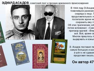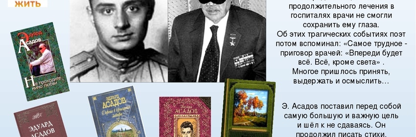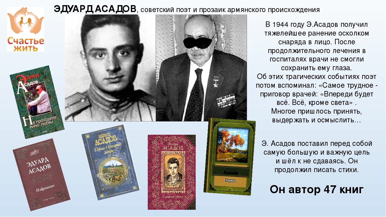 Добрый день, дорогие друзья! Сегодня мы хотим посвятить нашу встречу поэзии. А, именно, творчеству поэта-фронтовика Эдуарда Асадова. Эдуард Асадов является известным советским поэтом, творческому наследию которого принадлежит 47 книг и сборников стихотворений. Лишенный зрения во время Великой Отечественной войны Эдуард Асадов не бросил писать стихи, а наоборот с еще большим рвением и тягой к жизни продолжал писать и радовать своих читателей новыми работами.