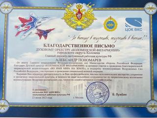23 июня Духовой оркестр Коломенской филармонии, под управлением главного дирижёра заслуженного работника культуры РФ Александра Пономарева, принял участие в патриотической акции-концерте «Во имя мира на земле» в Центральном офицерском клубе Воздушно-космических сил» РФ г. Москва. Солист оркестра Юрий Меркулов и артист Духового оркестра Владимир Дмитриев. Ведущий программы Олег Фомушкин.