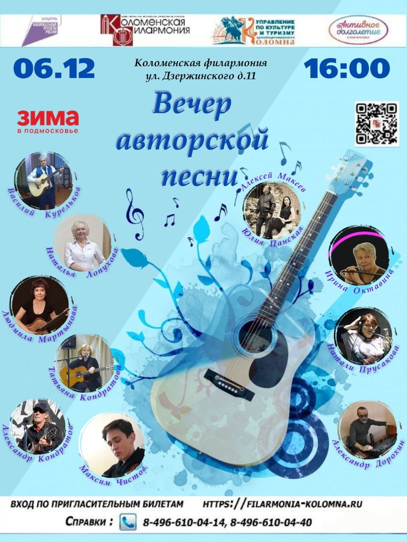 6 декабря в 16:00 ч. в зале Коломенской филармонии состоится вечер авторской песни.
