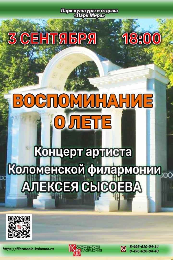 В этот вечер парк Мира наполнится певучими звуками аккордеона. Алексей Сысоев пользуется заслуженной популярностью среди жителей Коломны. Его имя стало синонимом высочайшего профессионализма в сфере музыкального искусства. Мастерство Алексея Вячеславовича охватывает широкий спектр жанров и направлений, от классической музыки до джаза, от органных композиций до народных мелодий.