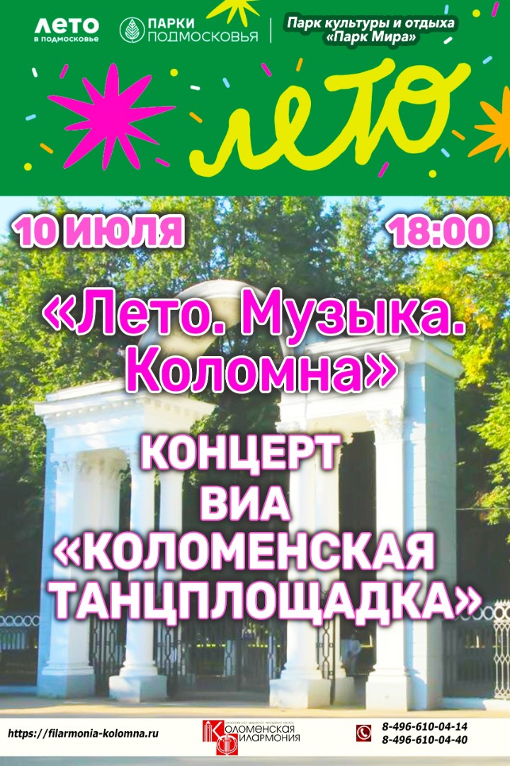 Коломенская филармония приглашает вас на серию концертов, которые пройдут на открытых площадках нашего города. Творческие коллективы филармонии с радостью представят свою программу, исполнив любимые мелодии и популярные песни в романтичной атмосфере. Приглашаем вас насладиться искусством в уютной обстановке открытых пространств.