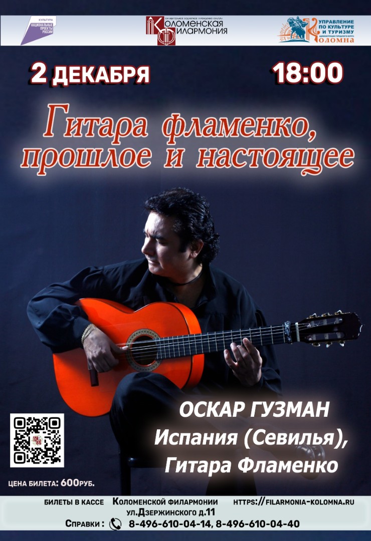 2 декабря в 18:00 ч. в зале Коломенской филармонии выступит севильский гитарист фламенко Оскар Гузман. Мастер с мировым именем выступит с концертом для любителей и ценителей гитарной музыки.