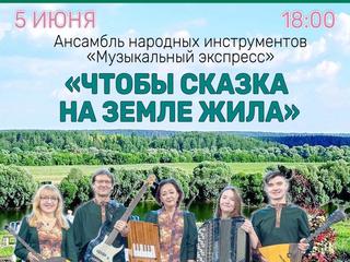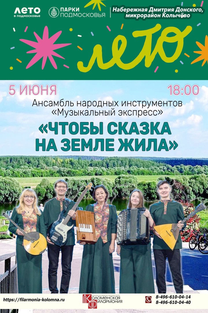 5 июня в 18.00 ч. для жителе и гостей микрорайона Колычёво выступит лауреат международных конкурсов ансамбль народных инструментов "Музыкальный экспресс", руководитель Ольга Лоткова. На живописном берегу реки Ока прозвучит лирическая программа "Чтобы сказка на земле жила". Встречаемся на набережной Дмитрия Донского.