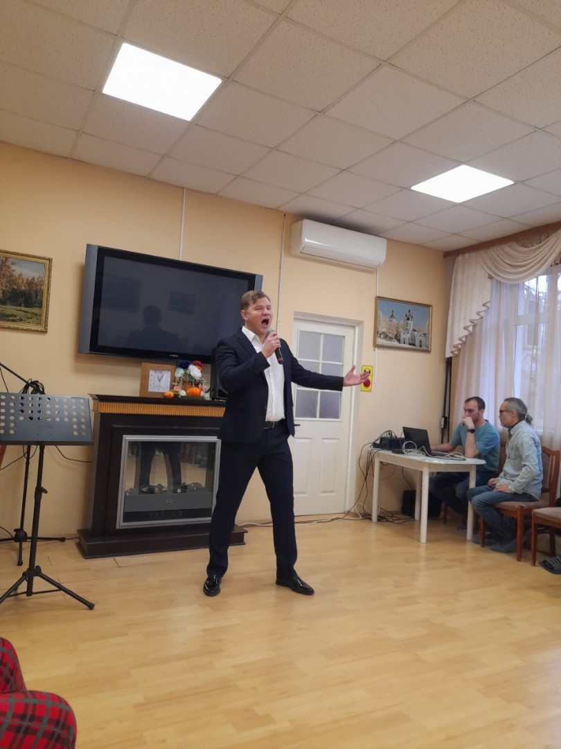 Проживающие стационарного отделения смогли услышать и увидеть невероятное выступление солиста Коломенской филармонии Владимира Лютикова. Его голос – это нечто особенное, он звучал так чисто и проникновенно, что никого не оставил равнодушным, тронув до глубины души. А любимые песни советской эпохи, которые исполнил артист, вызвали бурю положительных эмоций и теплых воспоминаний. Мы от всей души благодарим Коломенскую филармонию за этот чудесный подарок для наших подопечных!