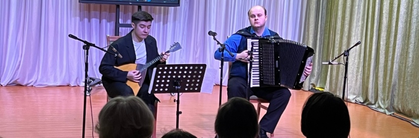 Программа прозвучала в исполнении заслуженного артиста Московской области Алексея Сысоева (аккордеон) и лауреата международных конкурсов Виктора Новикова (балалайка).